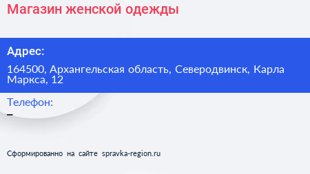 Магазин женской одежды по адресу 164500, Архангельская область, Северодвинск, Карла Маркса, 12 в дальнейшем Организация, размещена в следующих категориях: