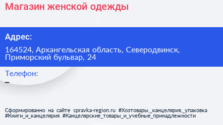 Магазин женской одежды по адресу 164524, Архангельская область, Северодвинск, Приморский бульвар, 24 в дальнейшем Организация, размещена в следующих категориях: