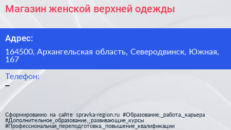 Магазин женской верхней одежды по адресу 164500, Архангельская область, Северодвинск, Южная, 167 в дальнейшем Организация, размещена в следующих категориях: