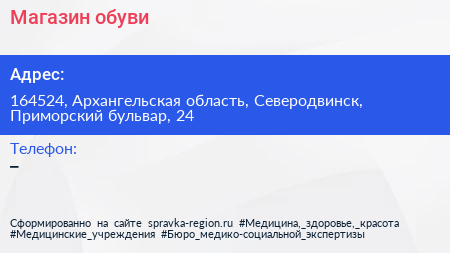 Магазин обуви по адресу 164524, Архангельская область, Северодвинск, Приморский бульвар, 24 в дальнейшем Организация, размещена в следующих категориях: