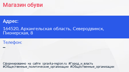 Магазин обуви по адресу 164520, Архангельская область, Северодвинск, Пионерская, 8 в дальнейшем Организация, размещена в следующих категориях: