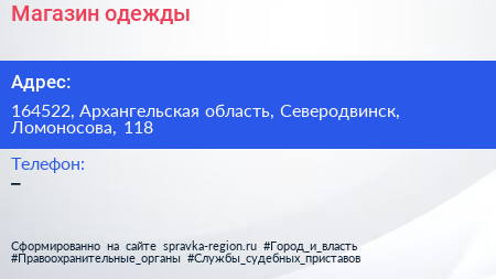 Магазин одежды по адресу 164522, Архангельская область, Северодвинск, Ломоносова, 118 в дальнейшем Организация, размещена в следующих категориях: