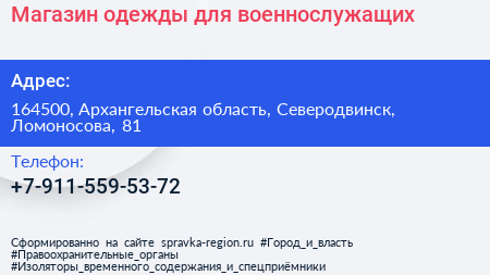 Магазин одежды для военнослужащих по адресу 164500, Архангельская область, Северодвинск, Ломоносова, 81 в дальнейшем Организация, размещена в следующих категориях: