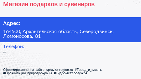 Магазин подарков и сувениров по адресу 164500, Архангельская область, Северодвинск, Ломоносова, 81 в дальнейшем Организация, размещена в следующих категориях: