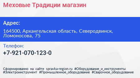 Меховые Традиции, магазин по адресу 164500, Архангельская область, Северодвинск, Ломоносова, 75 в дальнейшем Организация, размещена в следующих категориях: