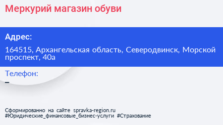 Меркурий, магазин обуви по адресу 164515, Архангельская область, Северодвинск, Морской проспект, 40а в дальнейшем Организация, размещена в следующих категориях: