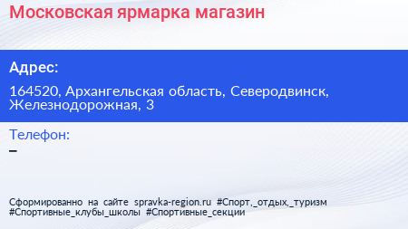 Московская ярмарка, магазин по адресу 164520, Архангельская область, Северодвинск, Железнодорожная, 3 в дальнейшем Организация, размещена в следующих категориях: