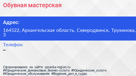 Обувная мастерская по адресу 164522, Архангельская область, Северодвинск, Трухинова, 3 в дальнейшем Организация, размещена в следующих категориях: