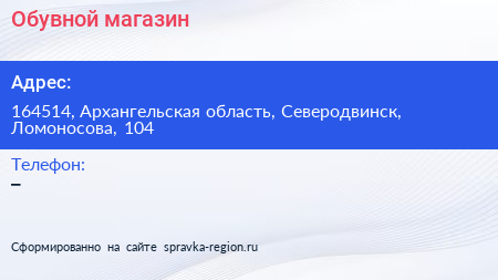 Обувной магазин по адресу 164514, Архангельская область, Северодвинск, Ломоносова, 104 в дальнейшем Организация, размещена в следующих категориях: