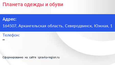 Планета одежды и обуви по адресу 164507, Архангельская область, Северодвинск, Южная, 1 в дальнейшем Организация, размещена в следующих категориях: