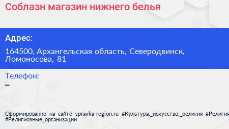 Соблазн, магазин нижнего белья по адресу 164500, Архангельская область, Северодвинск, Ломоносова, 81 в дальнейшем Организация, размещена в следующих категориях:
