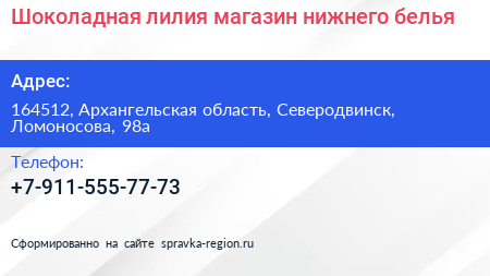Шоколадная лилия, магазин нижнего белья по адресу 164512, Архангельская область, Северодвинск, Ломоносова, 98а в дальнейшем Организация, размещена в следующих категориях: