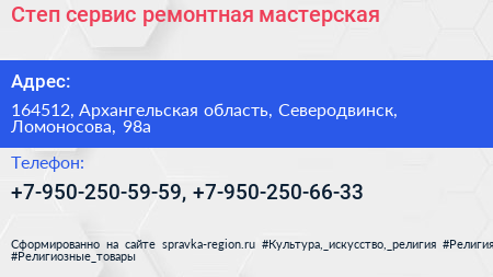 Степ-сервис, ремонтная мастерская по адресу 164512, Архангельская область, Северодвинск, Ломоносова, 98а в дальнейшем Организация, размещена в следующих категориях: