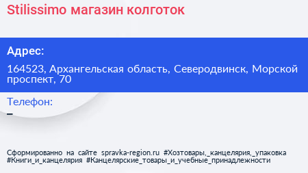 Stilissimo, магазин колготок по адресу 164523, Архангельская область, Северодвинск, Морской проспект, 70 в дальнейшем Организация, размещена в следующих категориях: