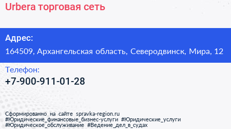 Urbera, торговая сеть по адресу 164509, Архангельская область, Северодвинск, Мира, 12 в дальнейшем Организация, размещена в следующих категориях: