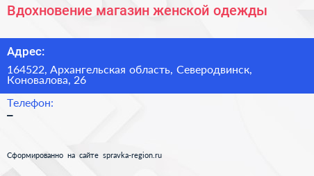 Вдохновение, магазин женской одежды по адресу 164522, Архангельская область, Северодвинск, Коновалова, 26 в дальнейшем Организация, размещена в следующих категориях: