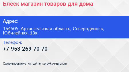 Блеск, магазин товаров для дома по адресу 164505, Архангельская область, Северодвинск, Юбилейная, 13а в дальнейшем Организация, размещена в следующих категориях: