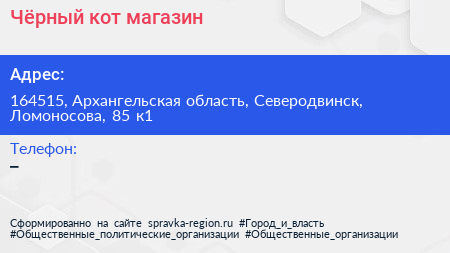 Чёрный кот, магазин по адресу 164515, Архангельская область, Северодвинск, Ломоносова, 85 к1 в дальнейшем Организация, размещена в следующих категориях: