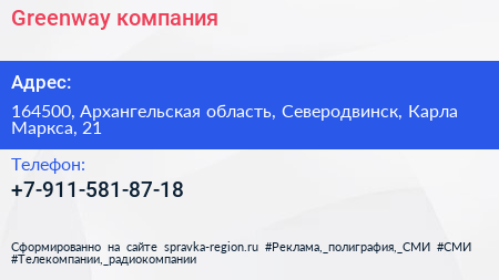 Greenway, компания по адресу 164500, Архангельская область, Северодвинск, Карла Маркса, 21 в дальнейшем Организация, размещена в следующих категориях:
