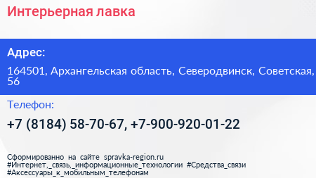 Интерьерная лавка по адресу 164501, Архангельская область, Северодвинск, Советская, 56 в дальнейшем Организация, размещена в следующих категориях: