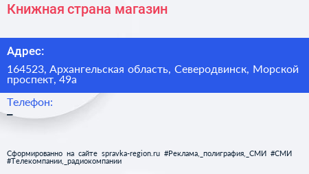 Книжная страна, магазин по адресу 164523, Архангельская область, Северодвинск, Морской проспект, 49а в дальнейшем Организация, размещена в следующих категориях: