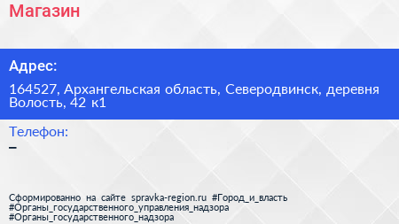 Магазин по адресу 164527, Архангельская область, Северодвинск, деревня Волость, 42 к1 в дальнейшем Организация, размещена в следующих категориях: