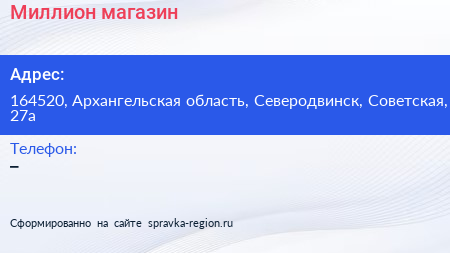 Миллион, магазин по адресу 164520, Архангельская область, Северодвинск, Советская, 27а в дальнейшем Организация, размещена в следующих категориях: