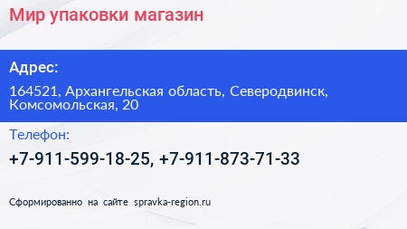 Мир упаковки, магазин по адресу 164521, Архангельская область, Северодвинск, Комсомольская, 20 в дальнейшем Организация, размещена в следующих категориях: