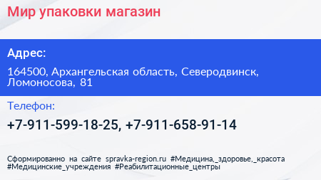 Мир упаковки, магазин по адресу 164500, Архангельская область, Северодвинск, Ломоносова, 81 в дальнейшем Организация, размещена в следующих категориях: