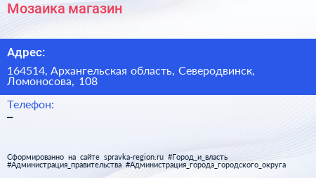 Мозаика, магазин по адресу 164514, Архангельская область, Северодвинск, Ломоносова, 108 в дальнейшем Организация, размещена в следующих категориях: