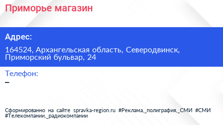 Приморье, магазин по адресу 164524, Архангельская область, Северодвинск, Приморский бульвар, 24 в дальнейшем Организация, размещена в следующих категориях: