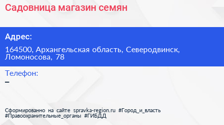 Садовница, магазин семян по адресу 164500, Архангельская область, Северодвинск, Ломоносова, 78 в дальнейшем Организация, размещена в следующих категориях: