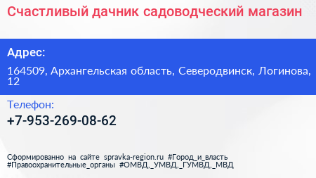 Счастливый дачник, садоводческий магазин по адресу 164509, Архангельская область, Северодвинск, Логинова, 12 в дальнейшем Организация, размещена в следующих категориях: