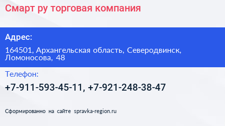 Смарт.ру, торговая компания по адресу 164501, Архангельская область, Северодвинск, Ломоносова, 48 в дальнейшем Организация, размещена в следующих категориях: