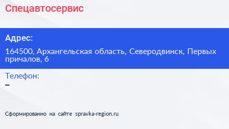 Спецавтосервис по адресу 164500, Архангельская область, Северодвинск, Первых причалов, 6 в дальнейшем Организация, размещена в следующих категориях: