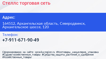 Стеллс, торговая сеть по адресу 164512, Архангельская область, Северодвинск, Архангельское шоссе, 120 в дальнейшем Организация, размещена в следующих категориях: