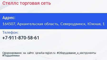 Стеллс, торговая сеть по адресу 164507, Архангельская область, Северодвинск, Южная, 1 в дальнейшем Организация, размещена в следующих категориях: