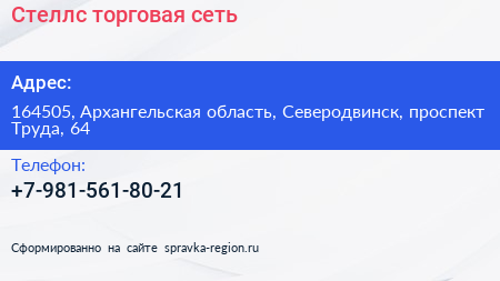 Стеллс, торговая сеть по адресу 164505, Архангельская область, Северодвинск, проспект Труда, 64 в дальнейшем Организация, размещена в следующих категориях: