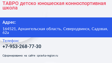 ТАВРО, детско-юношеская конноспортивная школа по адресу 164521, Архангельская область, Северодвинск, Садовая, 62а в дальнейшем Организация, размещена в следующих категориях: