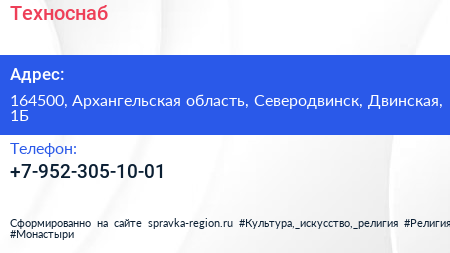 Техноснаб по адресу 164500, Архангельская область, Северодвинск, Двинская, 1Б в дальнейшем Организация, размещена в следующих категориях: