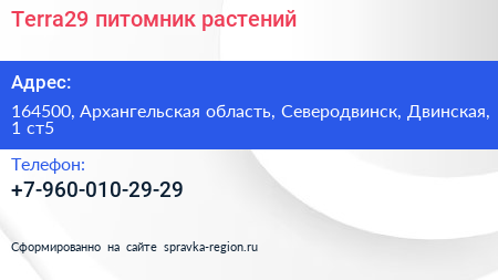 Terra29, питомник растений по адресу 164500, Архангельская область, Северодвинск, Двинская, 1 ст5 в дальнейшем Организация, размещена в следующих категориях: