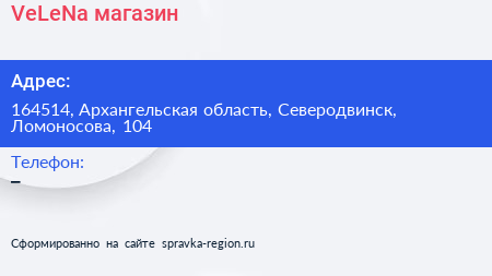 VeLeNa, магазин по адресу 164514, Архангельская область, Северодвинск, Ломоносова, 104 в дальнейшем Организация, размещена в следующих категориях: