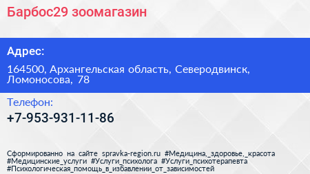 Барбос29, зоомагазин по адресу 164500, Архангельская область, Северодвинск, Ломоносова, 78 в дальнейшем Организация, размещена в следующих категориях: