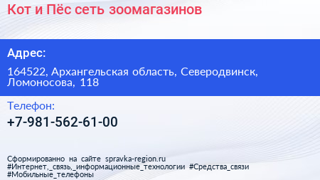 Кот и Пёс, сеть зоомагазинов по адресу 164522, Архангельская область, Северодвинск, Ломоносова, 118 в дальнейшем Организация, размещена в следующих категориях: