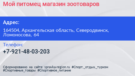 Мой питомец, магазин зоотоваров по адресу 164504, Архангельская область, Северодвинск, Ломоносова, 64 в дальнейшем Организация, размещена в следующих категориях: