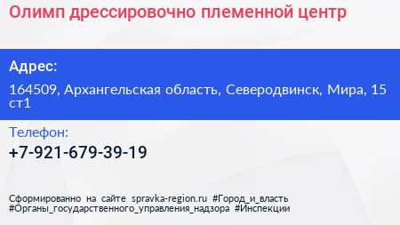 Олимп, дрессировочно-племенной центр по адресу 164509, Архангельская область, Северодвинск, Мира, 15 ст1 в дальнейшем Организация, размещена в следующих категориях:
