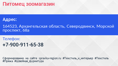 Питомец, зоомагазин по адресу 164523, Архангельская область, Северодвинск, Морской проспект, 68а в дальнейшем Организация, размещена в следующих категориях: