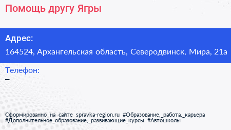 Помощь другу Ягры по адресу 164524, Архангельская область, Северодвинск, Мира, 21а в дальнейшем Организация, размещена в следующих категориях: