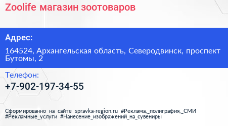 Zoolife, магазин зоотоваров по адресу 164524, Архангельская область, Северодвинск, проспект Бутомы, 2 в дальнейшем Организация, размещена в следующих категориях: