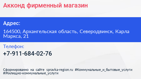 Акконд, фирменный магазин по адресу 164500, Архангельская область, Северодвинск, Карла Маркса, 21 в дальнейшем Организация, размещена в следующих категориях: